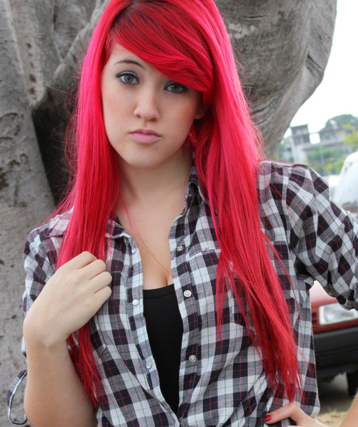 Imagem de moça de longos cabelos lisos e vermelhos usando uma camiseta preta e uma camisa de flanela por cima enquanto faz pose em frente a uma árvore. Anne Forfun. Fonte: https://mundodasfofas.webnode.page/entrevistas-com-fakes/